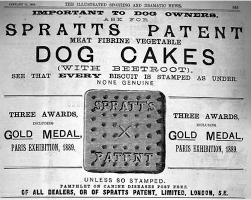 The first commercial pet food was developed in 1860 by James Spratt, an Ohio electrician. While in the UK selling lightning rods, he saw dogs eating leftover hardtack — dry biscuits sailors used on long journeys. Seeing a need for shelf-stable pet food, Spratt created the first dog biscuit, made of wheat, vegetables, beetroot, and dried parts of Prairie Beef. Despite their high cost — a 50-pound bag equaled a skilled craftsman’s daily wages — Spratt targeted wealthy English gentlemen.