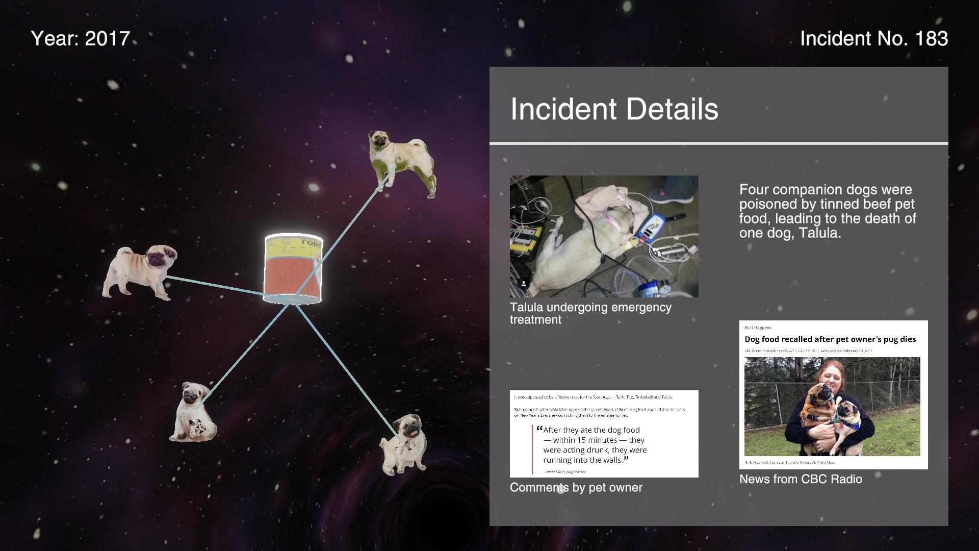 The motivation behind this project stems from the death of Dobby, one of the authors' cats, due to toxic pet food. Under pet capitalism, the loss of these lives is denied and forgotten. Our data visualization platform encourages visitors to report incidents they know of, filling in the gaps in data through a form of activism. At the same time, this project serves as a memorial to the lives that have been lost.